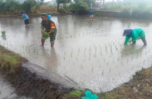 Dukung Ketahanan Pangan Wilayah, Babinsa Sumberboto Bantu Petani Tanam Padi