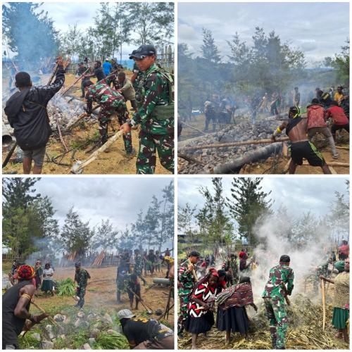 Minggu Berkah Bersama, Satgas Yonif 641/Bru Ikuti Acara Adat Bakar Batu di Distrik Napua