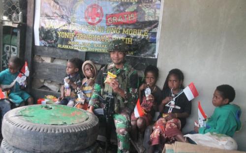 Senyum Ceria Anak - anak Bersama Satgas Yonif 323 Buaya Putih
