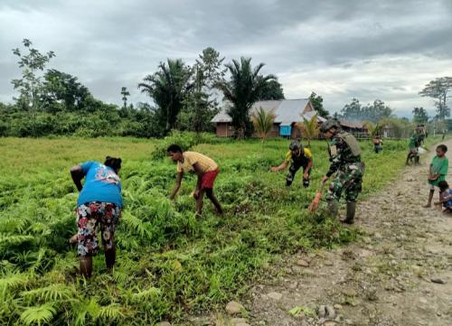 Warga Semangat Kerja Bakti Bersama Satgas TNI Bersihkan Kampung Mumugu