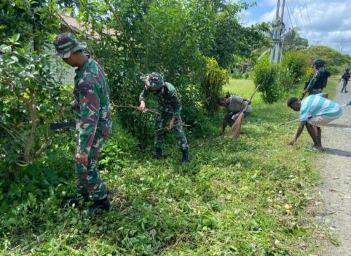 Jaga Kebersihan, Satgas Yonif 122/TS Ajak Masyarakat Kampung Yetti Laksanakan Karya Bhakti