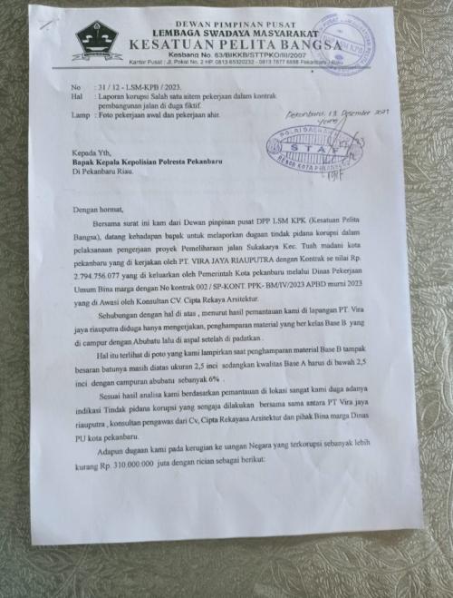 LSM KPB Laporkan Kerja PT.Vira Jaya Riau Putra ke Polresta Pekanbaru