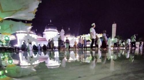 Hujan Guyur Jamaah di MRB Banda Aceh Saat Sholat Tarawih Perdana