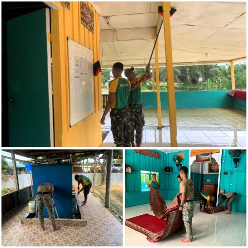 Satgas Pamtas Yonarmed 11 Kostrad Bersama TDM dan Warga Gotong Royong Bersihkan Masjid Al-Ikhlas di Perbatasan