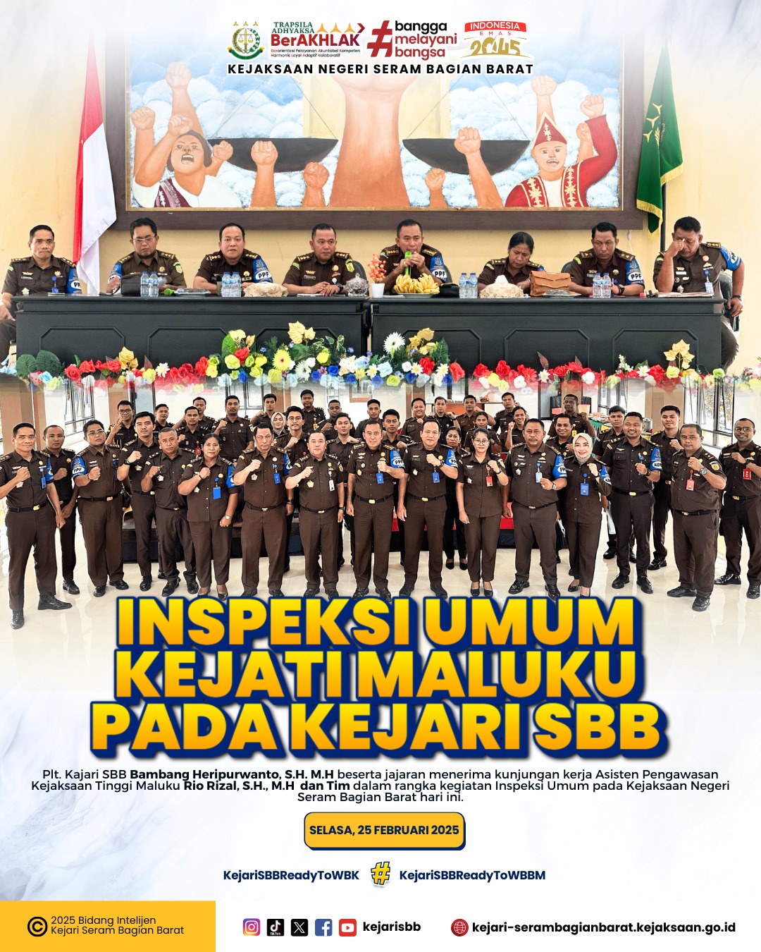 Seram Bagian Barat - Plt Kajari SBB Bambang Heripurwanto, S.H., M.H beserta para Kasi dan seluruh jajaran menerima kunjungan kerja dari Asisten Pengawasan pada Kejaksaan Tinggi Maluku Rio Rizal S.H., M.H beserta rombongan dalam rangka kegiatan Inspeksi Umum pada Kejaksaan Negeri Seram Bagian Barat.