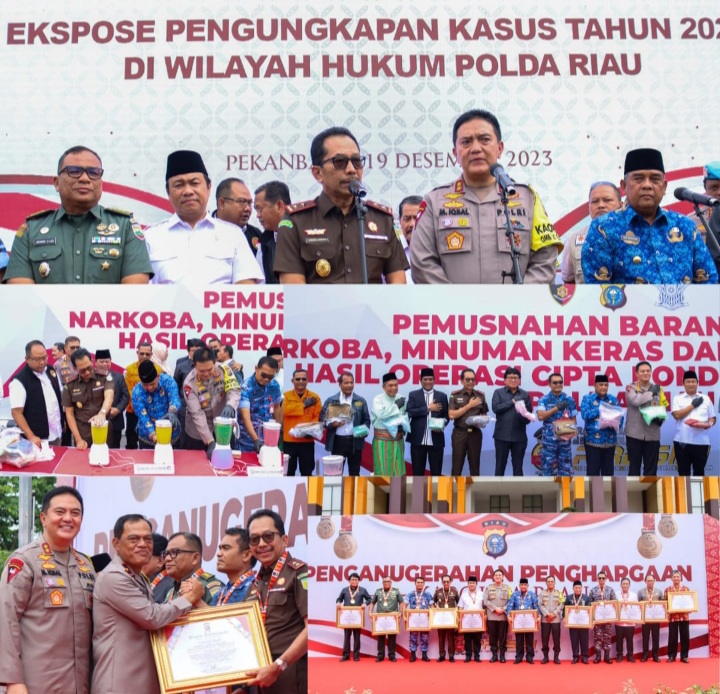 Pekanbaru - Kajati Riau Hadiri Kegiatan Ekspose Pengungkapan Kasus Tahun 2023 di Wilayah Hukum Polda Riau, Pemusnahan Barang Bukti Tindak Pidana Hasil Operasi Cipta Kondisi Polda Riau dan Penganugerahan Penghargaan Kapolda Riau kepada Forkopimda Provinsi Riau