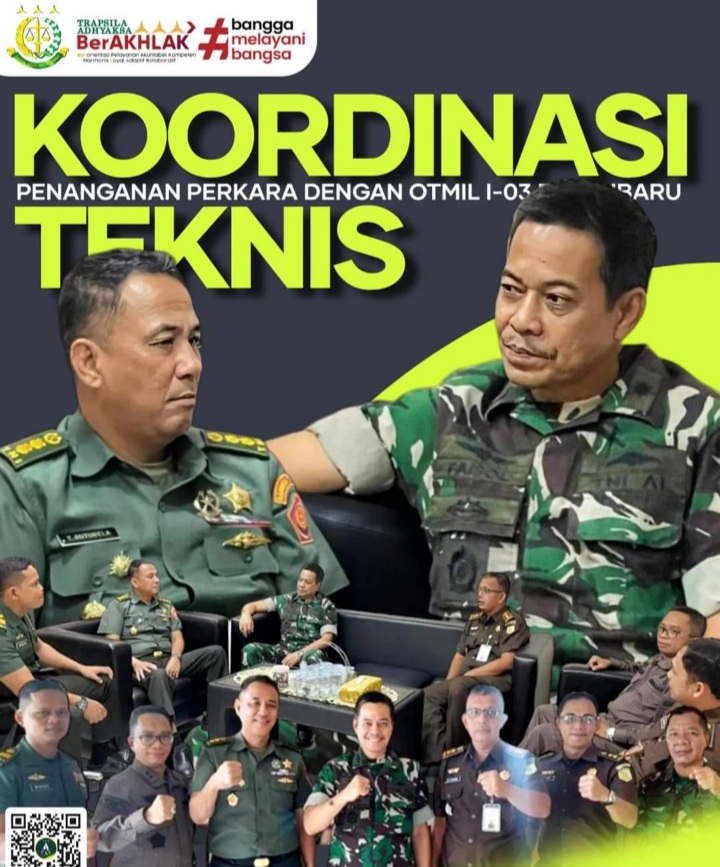 Koordinasi teknis penanganan perkara yang dimaksud adalah dalam penyelesaian beberapa perkara diantaranya : perkara An.Serma 'AW' & Sertu 'ES' (perkara pencurian dengan kekerasan di Pekanbaru) dimana saat ini untuk Terdakwa Serma 'AW' telah dieksekusi oleh Otmil I-03 sedangkan Terdakwa Sertu 'ES' telah dilakukan eksekusi putusan (inkracht) pada Desember 2023 lalu.