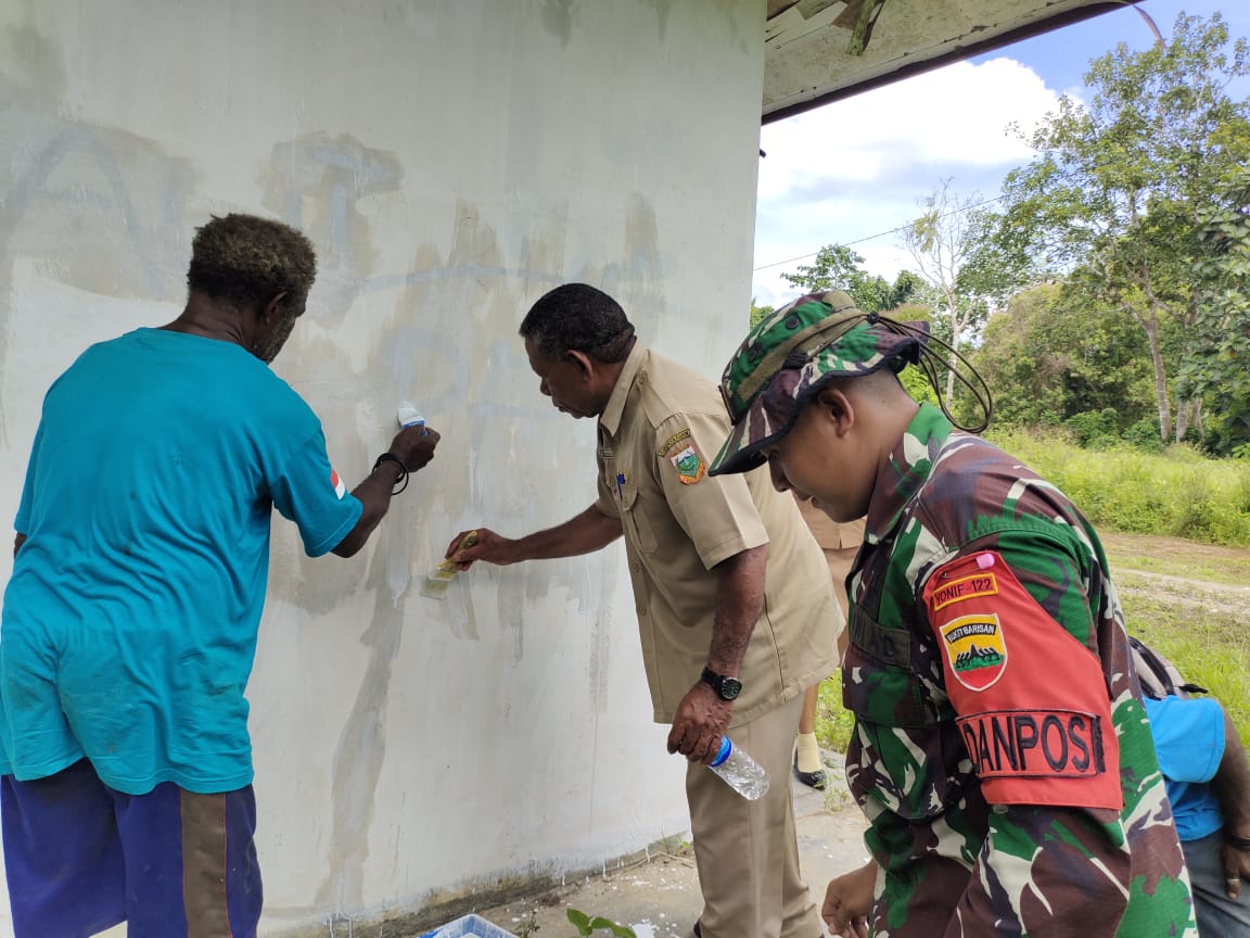 Melihat kondisi rumah dinas Kepsek yang kurang layak huni karena sudah lama tidak ditempati, Personel Pos Sawiyatami Satgas Pamtas RI-PNG Yonif 122/Tombak Sakti turut serta membantu membersihkan dan melaksanakan pengecatan ulang Rumah Dinas Kepala Sekolah.