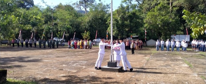 Satgas Pamtas RI-Malaysia Yonarmed 16/TK Pos Koki Gabma Jagoi Babang yang dipimpin langsung oleh Danki 1 Koki Gabma Jagoi Babang Kapten Arm Ervin Panji Gama Putra beserta 6 orang anggota lainnya melaksanakan upacara Hari Jadi Kabupaten Bengkayang yang ke-25 di halaman Kantor Kecamatan Jagoi Babang Kab. Bengkayang, Provinsi Kalimantan Barat. Senin (28/4/2024)