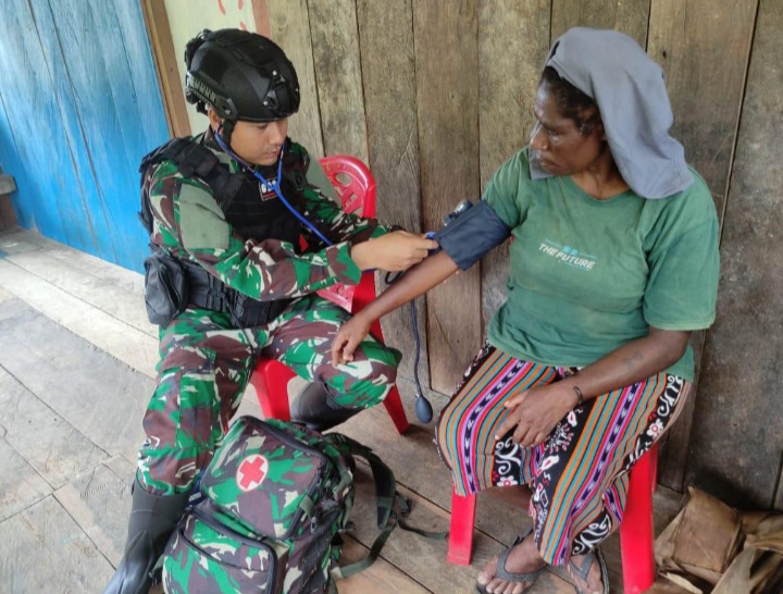Anggota Satgas Pos Konja disela melaksanakan tugas pokok dalam pengamanan wilayah Papua juga berkeliling kampung dengan membawa obat-obatan untuk kampung binaannya.