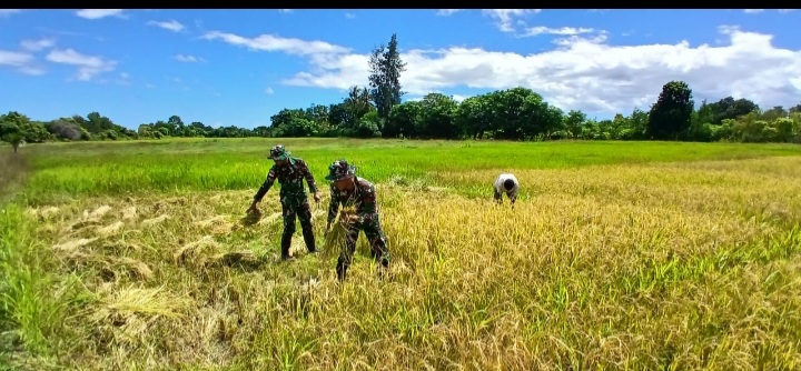 Netemnanu, NTT - Tingkatkan Ketahanan Pangan Lokal, Pos Oepoli Tengah Satgas Yonkav 6/Naga Karimata bantu Panen padi di Sawah milik Bpk. Wens berlokasi di Desa Netemnanu, Kec. Amfoang Timur, Kab. Kupang, Prov. NTT. (30/4/24)
