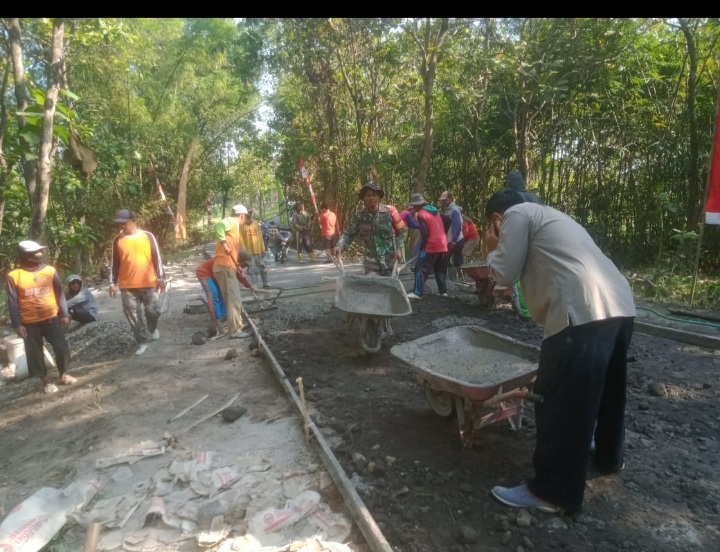 Sragen - Dengan semangat gotong-royong masyarakat bersama Babinsa bahu membahu melaksanakan kegiatany cor jalan desa yang saat ini kondisinya sudah sangat parah Dk. Muneng Rt 11 Ds. Bagor Kecamatan Miri, Jum’at (03/05/2024).