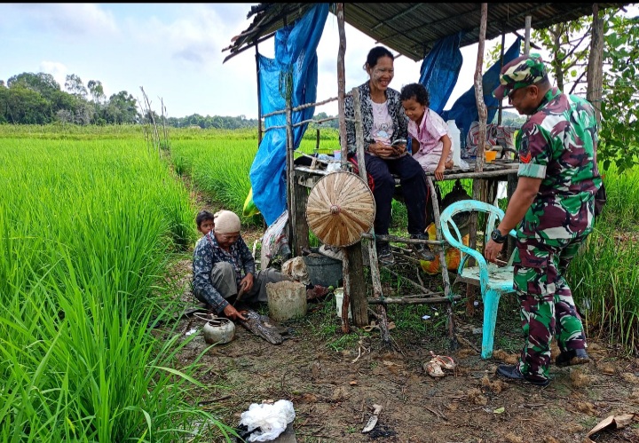 Kutai Kartanegara - Memperkuat keterlibatan Babinsa sebagai aparatur kewilayahan di suatu wilayah binaan, Babinsa Batuq Koptu Tamsyir melakukan kegiatan komunikasi sosial (komsos) dengan warganya yang sedang berada di salah satu areal pertanian desa Batuq kecamatan Muara Muntai kabupaten Kukar, Jumat (03/5/2024).