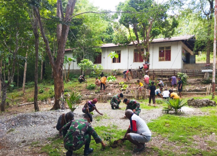 Naekake, NTT - Bantu masyarakat untuk bersihkan Gereja, Pos Naekake Satgas Yonkav 6/Naga Karimata berperan aktif untuk bersihkan gereja Katolik St Bernardus yang ada di Desa Naekake, Kecamatan Mutis, Kabupaten TTU, Provinsi NTT, Sabtu (04/5/2024).