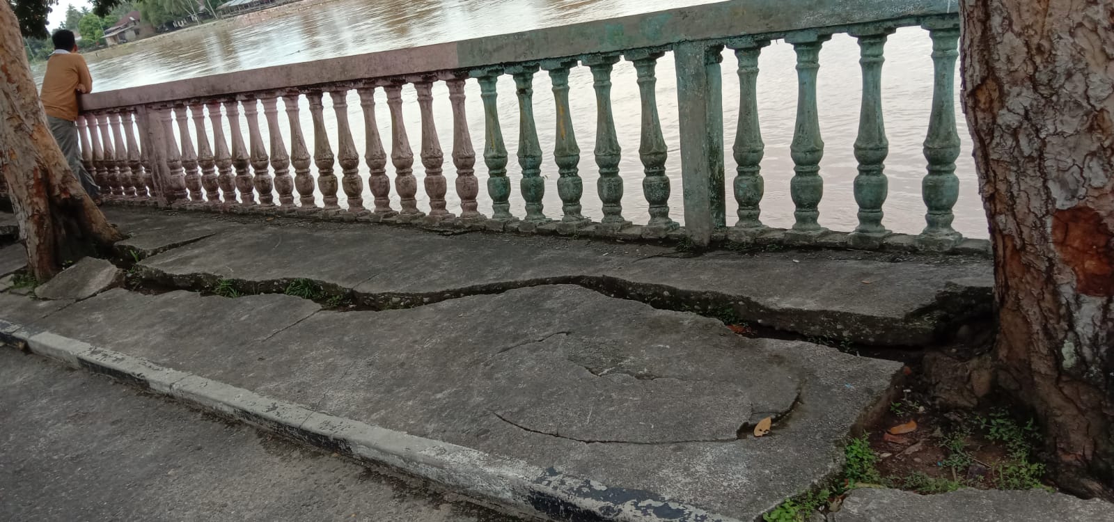 Kuansing - Sungguh prihatin kondisi pagar di tepian gelanggang arena Pariwisata Pacu Jalur Narosa Teluk Kuantan di Kecamatan Kuantan Tengah. Makin hari retaknya makin besar, mengakibatkan pagar dan bangunan turap lainnya ikut retak.