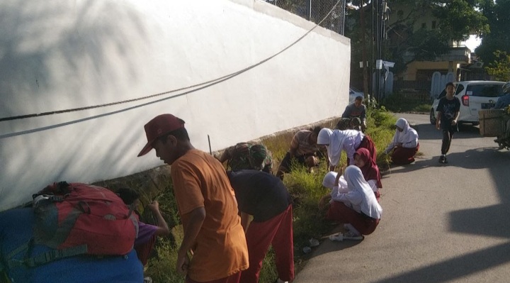 Gowa - Personel Koramil 05/Pallangga jajaran Kodim 1409/Gowa, mengajak siswa-siswi SD Mangalli bersama Pemerintah dan Masyarakat Setempat melaksanakan kegiatan karya bakti pembersihan lingkungan dan saluran air di jalan stadion Kalegowa Kelurahan Mangalli Kecamatan Pallangga Kabupaten Gowa, Rabu (08/5/2024).