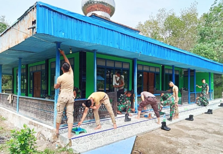 Kutai Kartanegara - Babinsa Koramil 0906-08/Muara Kaman Kodim 0906/Kutai Kartanegara (KKR) Serda Sunarto beserta peserta latsitardanus ke XLIV dan warga masyarakat melakukan kegiatan gotong royong pengecatan masjid Al Furqon yang berada di jalan KH. Ahmad Dahlan Desa Panca Jaya Kecamatan Muara Kaman, Sabtu (11/5/2024).