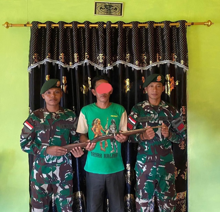 Sintang - Kegiatan pembinaan teritorial (Binter) anjangsana ke dusun atau kampung binaan yang dilakukan Posp Kout Satgas Pamtas RI – Malaysia Yonarmed 10/ Bradjamusti membuahkan hasil yang baik, mendekati purna tugas Pos Kout menerima kembali penyerahan secara sukarela 1 (satu) pucuk senjata api rakitan jenis lantak dari salah seorang warga berinisial S (54) di perbatasan. Bertempat di Desa Senanning, Kec. Ketungau Hulu, Kabupaten Sintang, Kalbar, Minggu (12/05/2024)
