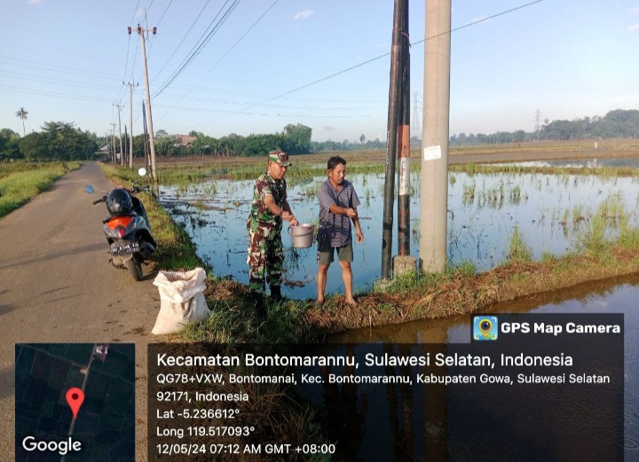 Gowa - Babinsa Koramil 03/Bontomarannu Kodim 1409/Gowa Serka Rizal bantu petani melaksanakan penyemaian benih padi di sawah milik Bapak Rusdi Dg. Siama, luas lahan ± 0,20 Ha di Lokasi Persawahan Jalan Borong Sapiri Lingkungan Bontomanai Kel. Bontomanai Kecamatan Bontomarannu Kabupaten Gowa, Minggu (12/05/2024).