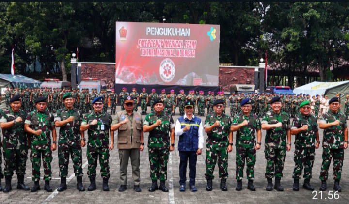 Cilangkap - Panglima TNI Jenderal TNI Agus Subiyanto yang diwakili oleh Irjen TNI Laksdya TNI Dadi Hartanto, M.Tr. (Han)., M.Tr.Opsla didampingi Wakil Menteri Kesehatan Dante Saksono Harbuwono mengukuhkan Emergency Medical Team (EMT) TNI tahun 2024, bertempat di Lapangan Apel Gedung B3 Mabes TNI, Cilangkap, Jakarta Timur, Senin (13/5/2024).