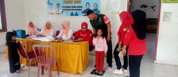 Gowa - Babinsa Koramil 1409-08/Bontonompo Kopda Syahrir terlihat aktif mendampingi warga pada kegiatan posyandu serta penimbangan Anak-anak balita di kantor kelurahan Tamallayang kecamatan Bontonompo Kabupaten Gowa, Rabu (15/5/2024).