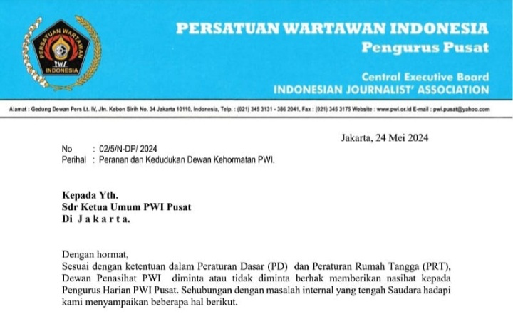 Dalam surat bernomor 02/5/N-DP/2024 tersebut, Dewan Penasehat menjelaskan, sesuai dengan Peraturan Dasar (PD) dan Peraturan Rumah Tangga (PRT) PWI, Dewan Penasehat berhak memberikan nasihat kepada Pengurus Harian PWI Pusat, baik diminta maupun tidak diminta. Surat ini merespons masalah internal yang sedang dihadapi oleh Ketua Umum dan jajaran Pengurus Harian PWI Pusat.