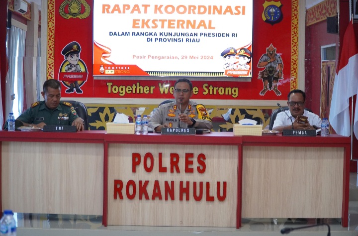 Rokan Hulu - Kapolres Rokan Hulu (Rohul) AKBP Budi Setiyono SIK MH memimpin Rapat Koordinasi (Rakor) Eksternal dalam rangka Kunjungan Kerja (Kunker) Presiden RI Joko Widodo (Jokowi) di Provinsi Riau, Rabu (29/5/2024) sekitar pukul 10.00 Wib.