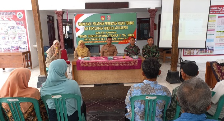 Satgas TMMD sengkuyung tahap II Kodim 0724/Boyolali bersama dinas Peternakan dan Perikanan Kaputen Boyolali mensosialisasikan cara pembuatan Ramuan Organik Ternak (Roter) dan Cara Fermentasi Pakan Ternak kepada Kelompok peternakan Desa Gunung yang bertempat di Aula Balai Desa Gunung Kecamatan Simo Kabupaten Boyolali, Senin (03/06/2024).