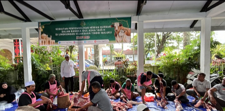 Ambon - Wakil Kepala Kejaksaan Tinggi Maluku Dr. Jefferdian, S.H., M.H didampingi Asisten Intelijen Kejaksaan Tinggi Maluku Rajendra D. Wiritanaya, S.H selaku Ketua Panitia Penyelenggara Qurban Kejaksaan Tinggi Maluku, melaksanakan pemotongan dan penyerahan daging qurban dalam rangka Hari Raya Idul Adha 1445 H, pada hari Selasa (18/6/2024).