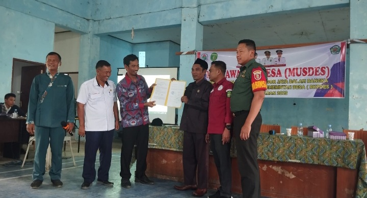 Kutai Kartanegara - Anggota Babinsa Koramil 0906-02/Loa Kulu Serma Muntok Roza'i hadiri musyawarah desa bertempat di gedung BPU Desa Jonggon Jaya Kecamatan Loa Kulu, Kabupaten Kutai Kartanegara, Rabu (19/6/2024).