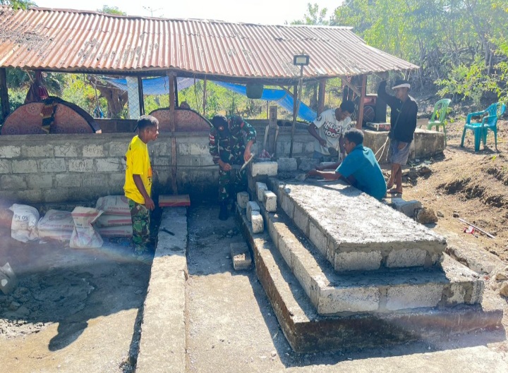 Tasinifu, NTT - Bantu masyarakat untuk memperindah makam, Pos Aplal Satgas Yonkav 6/Naga Karimata laksanakan perbantuan bersama masyarakat yang ada di Desa Tasinifu, Kec. Mutis, Kabupaten TTU, Provinsi NTT, Kamis (20/6/2024).