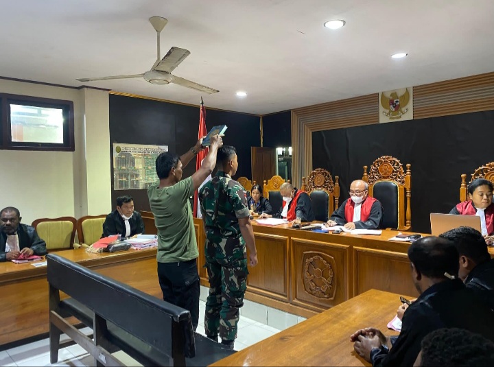 Dalam proses persidangan tersebut, satu Personel anggota Satgas Yonif 122/TS Serda Heri Juanda dengan didampingi Perwira Hukum Satgas Yonif 122/TS Letda Chk Muhammad Rizky Royhan, S.H., menjalani proses Pemeriksaan Saksi dengan memberikan keterangan guna melaksanakan proses Hukum yang berjalan.