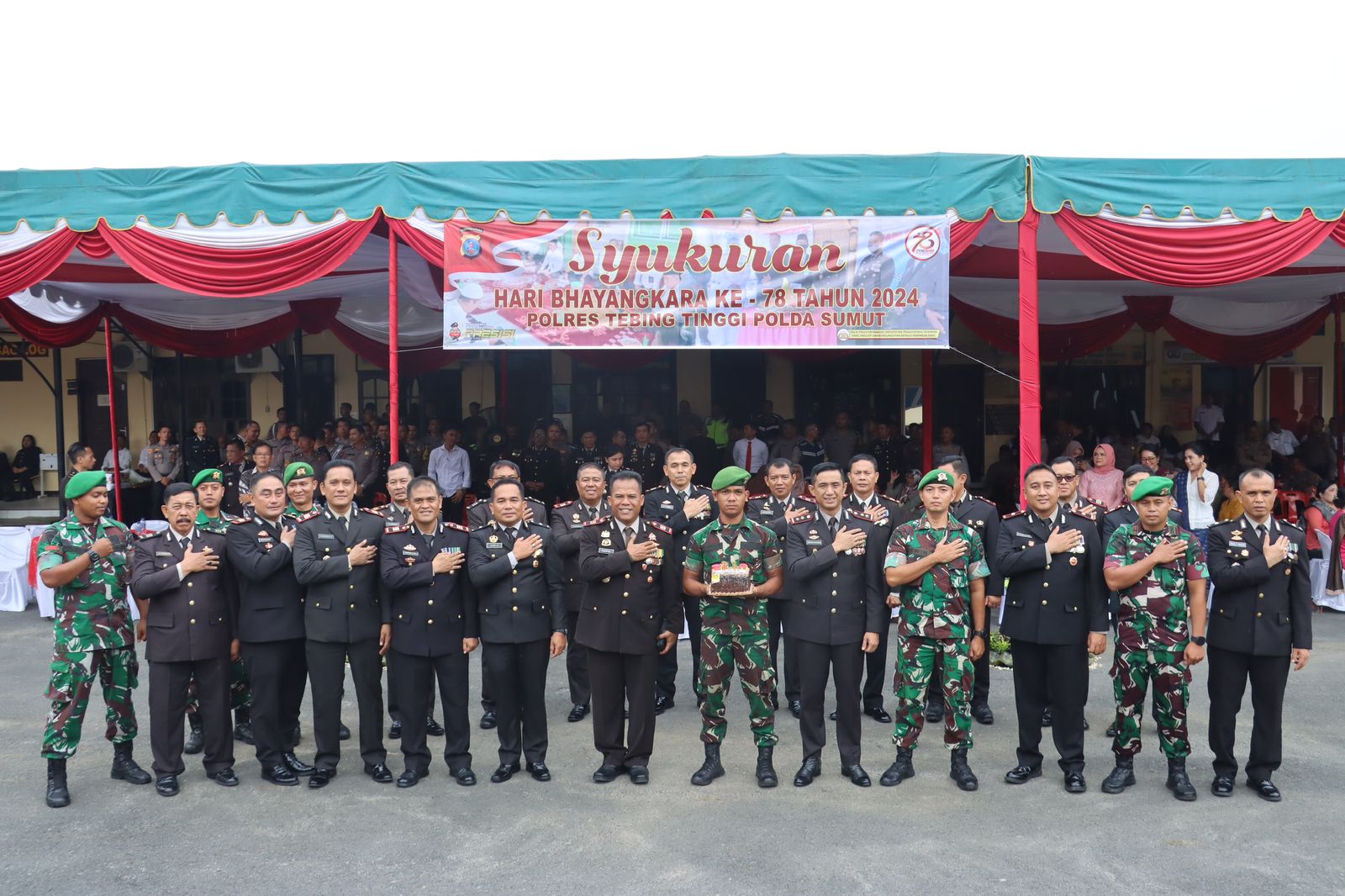 Tebing Tinggi - Usai melaksanakan upacara Hari Bhayangkara ke-78 di Lapangan Merdeka, Kapolres Tebing Tinggi AKBP Andreas LJ Tampubolon, S.I.K, M.K.P dan jajaran menggelar syukuran HUT Polri tersebut di Lapangan Apel Mapolres Tebing Tinggi, Jalan Pahlawan Kota Tebing Tinggi, Senin (01/07/2024).