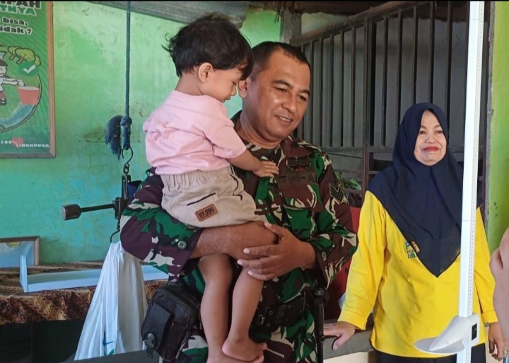 Serka Marsianto menyampaikan “Tujuan kegiatan ini adalah mengecek secara langsung kepada anak anak terutama balita yang terganggu perkembangannya untuk diberikan asupan gizi dan pelayanan kesehatan yang baik agar tidak berlarut-larut sehingga tidak berakibat Stunting,” jelas Babinsa.