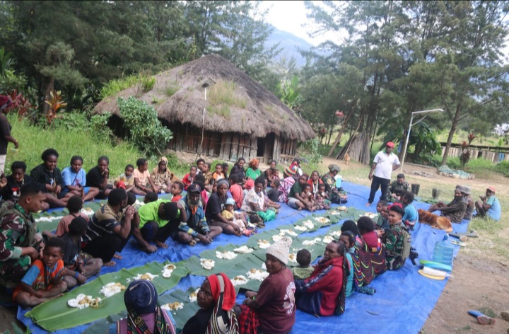 Ilaga - Prajurit Satgas Pamtas RI-PNG Mobile Yonif 323/BP Kostrad Pos Kosatgas melaksanakan kegiatan Minggu Kasih dengan melaksanakan makan bersama masyarakat Kp Kago, Distrik Ilaga, Kabupaten Puncak, Papua Tengah, Minggu (07/07/2024)