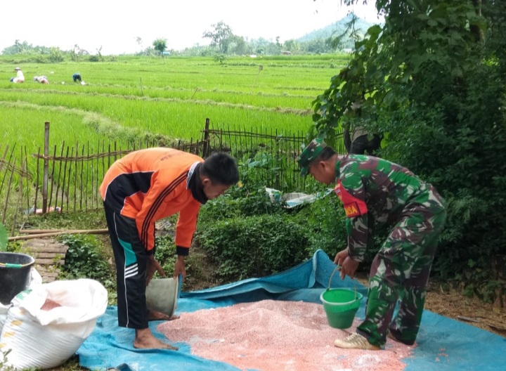 Di tengah terik matahari, Serka Darwanto turun ke sawah untuk memberikan bantuan dalam proses pemupukan padi di lahan Sawah milik Bp. Sunandar Tani Maju di Dk. Dukuh RT 07 Desa Plosorejo Kec. Gondang. Dengan senyum ramah dan penuh semangat, Babinsa menyambut petani dengan hangat.