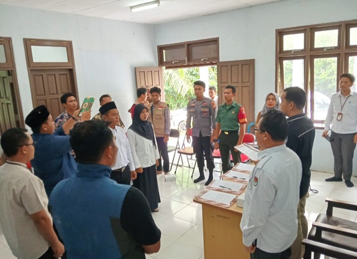 Kutai Kartanegara - Anggota Koramil 0906-09/Kota Bangun Kodim 0906/Kutai Kartanegara Kopda Eko bersama Bhabinkamtibmas hadiri acara pelantikan anggota PPS bertempat di kantor sekretariat PPK kecamatan yang berada di Desa Kedang Murung Kecamatan Kota Bangun. Selasa (09/7/2024).