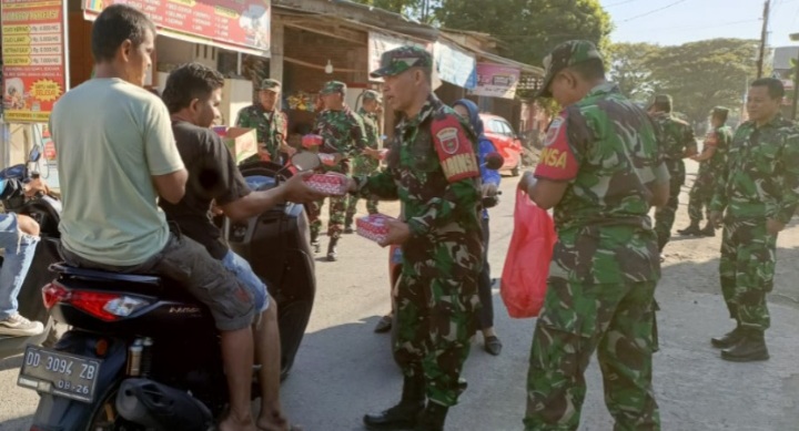 Gowa - Dalam rangka mempererat hubungan silatuhrahim antara TNI dan masyarakat Personel Koramil 1409-06/Bajeng Kodim 1409/Gowa melaksanakan kegiatan pembagian pembagian Snack Jum'at Berkah, di Jl. Nuhun Daeng Bani Kelurahan Kalebajeng Kecamatan Bajeng Kabuapten Gowa, Jumat (12/7/2024).