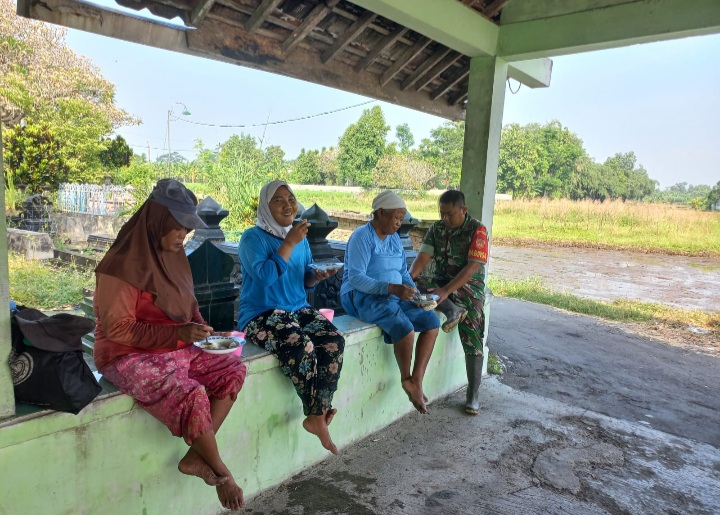 Dengan memanfaatkan waktu istirahat sejenak di sela-sela kerja, Sertu Zainal terlihat mengobrol santai bersama petani dengan menikmati makan dan minuman dingin yang di bekal dari rumah.