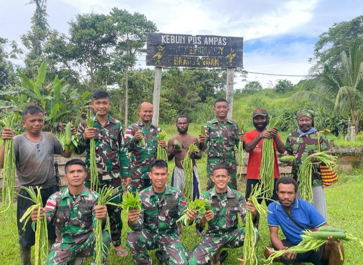 Keerom - Pos Ampas Satgas Yonif 122 / TS melaksanakan panen kacang panjang bersama masyarakat untuk mewujudkan kedekatan personel Satgas Yonif 122 / TS dengan masyarakat Kampung Ampas, Distrik Waris, Kabupaten Keerom, Papua, Kamis (18-07-2024 )