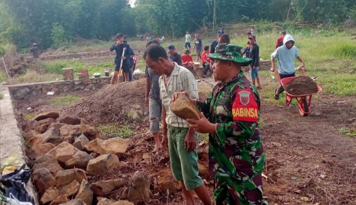 Gowa - Serka Abbasruddin Babinsa Desa Bontobiraeng selatan Koramil 1409 -08/Bontonompo, menunjukkan kekompakan mereka dalam kegiatan gotong royong pembuatan jalan pekuburan umum di dusun Anassappu desa Bontobiraeng selatan Kecamatan Bontonompo Kabupaten Gowa, Jumat (19/7/2024).