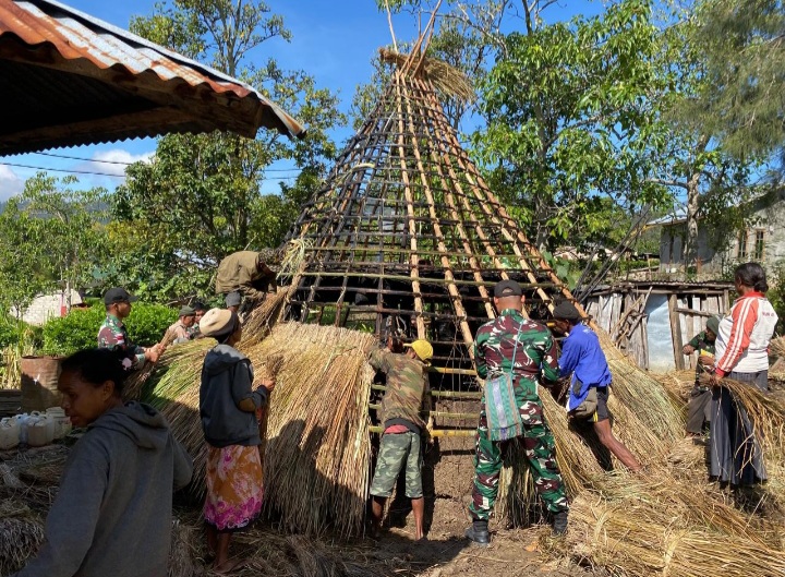 Manusasi, NTT - Pos Manusasi Satgas Yonkav 6/Naga Karimata laksanakan Gotong Royong untuk bantu masyarakat bangun rumah adat yang ada di Desa Manusasi, Kecamatan Miomaffo Barat, Kabupaten TTU, Provinsi NTT Minggu (21/7/2024).