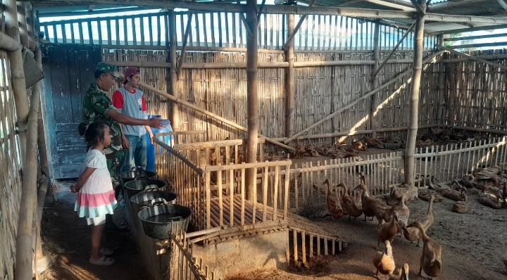 Boyolali - Babinsa Koramil 11/Ngemplak Kodim 0724/Boyolali Serka Sugianto menyambangi peternak bebek Bapak Adi (37) yang bertempat di Desa Sawahan Kecamatan Ngemplak Kabupaten Boyolali, Senin (22/07/2024).