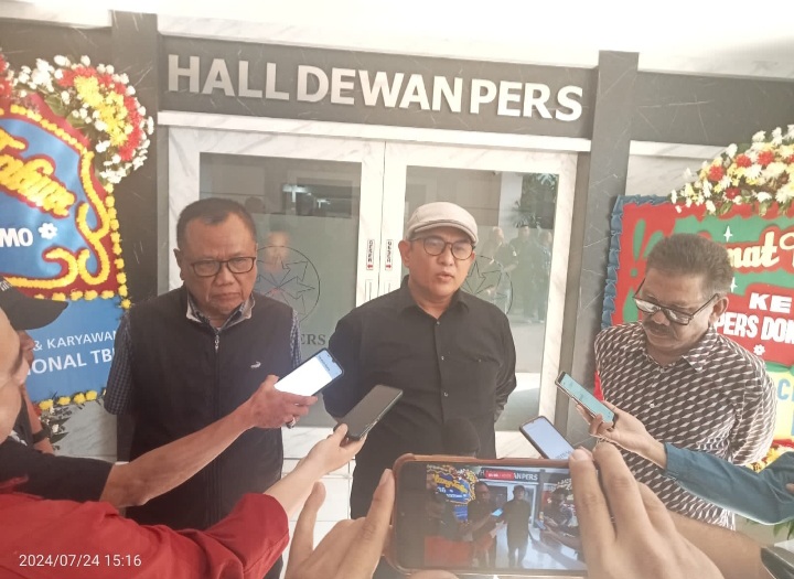 Plt Ketua Umum PWI Pusat, H Zulmasyah Sekekedang saat konferensi Pers usai rapat pleno di Kantor PWI Pusat, Rabu (24/7/2024) siang.