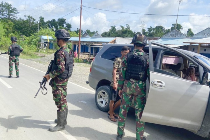 Keerom - Prajurit Satgas Pamtas RI-PNG Yonif 122/TS Pos Ujung Karang melaksanakan kegiatan pemeriksaan (Sweeping) di jalan tapal batas kampung Pikere tepat didepan pos Ujung Karang Distrik Arso Timur, Kabupaten Keerom, Papua, Jumat (26-07-2024).