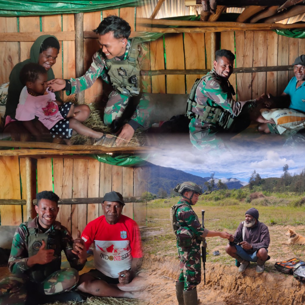 Gome - Personel Pos Gome Satgas Mobile Yonif 323 Buaya Putih pimpinan Lettu Inf Galang melaksanakan kegiatan keliling Honai masyarakat untuk membagikan sembako dan pelayanan kesehatan kepada masyarakat, Distrik Gome, Kabupaten Puncak, Papua Tengah, Selasa (30/07/24).