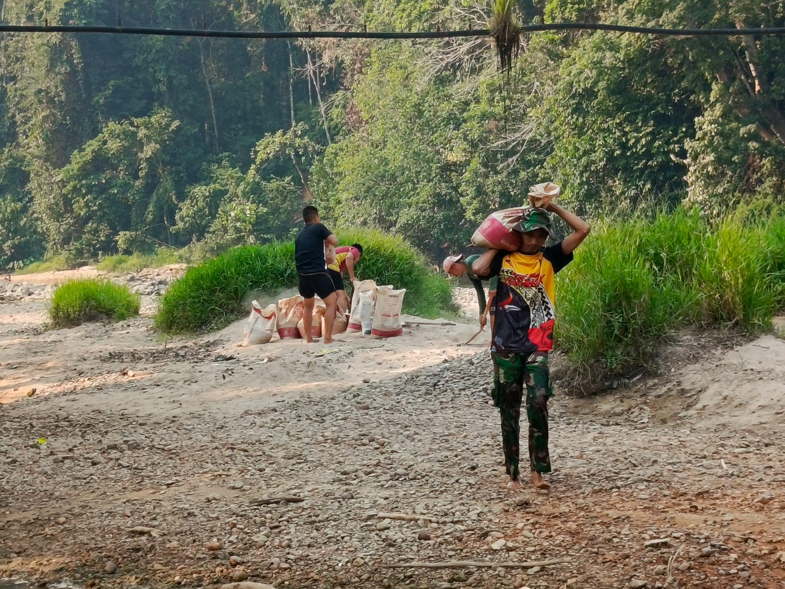 Lanjut Martinus, masyarakat dan Satgas TMMD saling bekerjasama dan bergotong-royong, dengan tak menghiraukan melewati sungai dalam pengerjaannya.