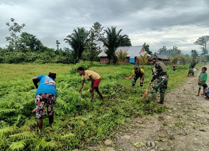 Warga Semangat Kerja Bakti Bersama Satgas TNI Bersihkan Kampung Mumugu Senin, 05/08/2024 | 22:52