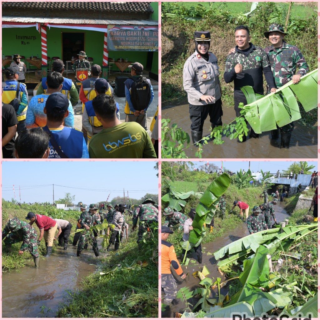 Sukoharjo - Dipimpin Dandim 0726/Sukoharjo Letkol Czi Slamet Riyadi, S.E., Kodim 0726/Sukoharjo bersama Polres Sukoharjo menggelar Karya Bhakti TNI-Polri Satkowil Kodim 0726/Sukoharjo, melaksanakan bersih-bersih normalisasi sungai bertempat di Sungai Cabak, Dk Sumuran Wetan RT 03/05 Ds Kragilan, Kecamatan Mojolaban bersama dengan Warga Masyarakat, BBWS Bengawan Solo, Senkom, Hipakad, Relawan MTA dan BPBD Sukoharjo, Selasa (06/08/24).
