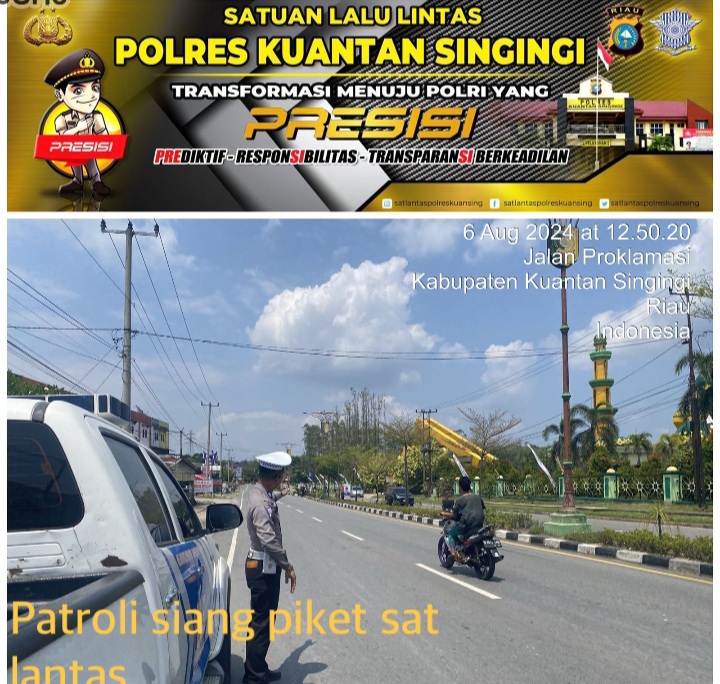 Kuansing - Satuan Lalu Lintas (Sat Lantas) Polres Kuansing melaksanakan kegiatan patroli siang dengan tujuan mengantisipasi daerah rawan kecelakaan lalu lintas, balap liar, dan tindak kejahatan C3 (curat, curas, dan curanmor) di wilayah Kota Teluk Kuantan. Pada hari Selasa, (6/8/2024), Patroli ini dimulai pada pukul 12.00 WIB hingga selesai, dengan fokus pada pengawasan dan penertiban lalu lintas di area yang dianggap rawan.